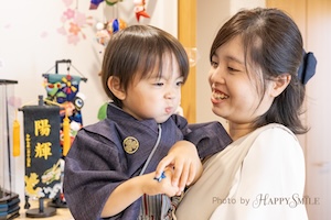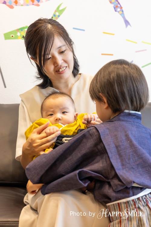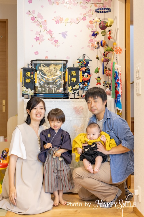 4人ご家族のお兄ちゃんと初節句の弟くんのお祝いフォトでした